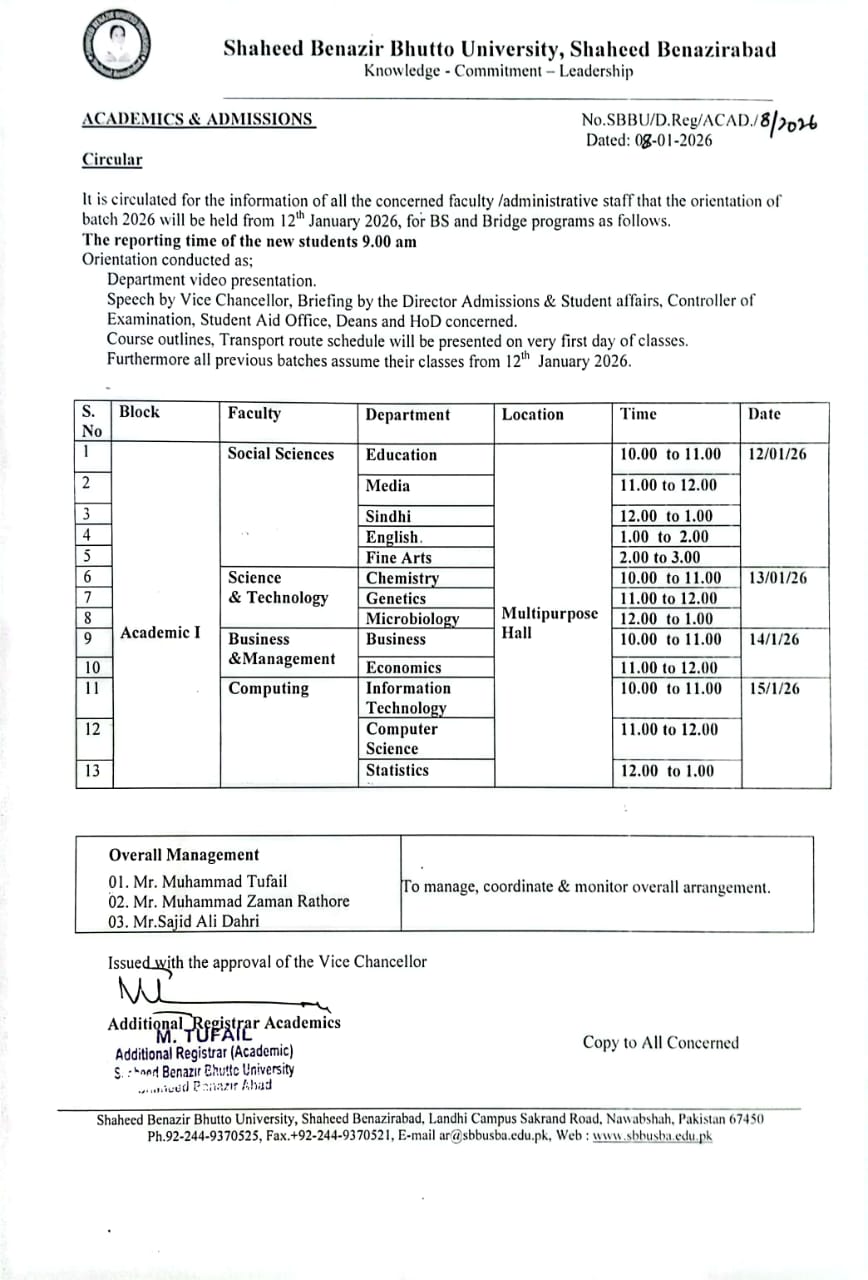 The orientation for BS and Bridge Program students of Batch 2026 will be held on 12th January 2026.